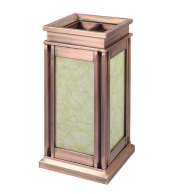 • 產(chǎn)品材質(zhì):采用天然的大理石與優(yōu)質(zhì)冷軋鋼板或不銹鋼鋼板制作而成,四面大理石用鋼板螺絲固定于桶體,有內(nèi)桶,方便提倒垃圾,桶頭煙灰盅可放白石子可清洗,鋼板經(jīng)折彎沖壓一次性成型。產(chǎn)品一律用室外粉靜電噴塑,經(jīng)過(guò)180°的高溫,延長(zhǎng)垃圾桶使用壽命,顏色持久不變亮麗如新。